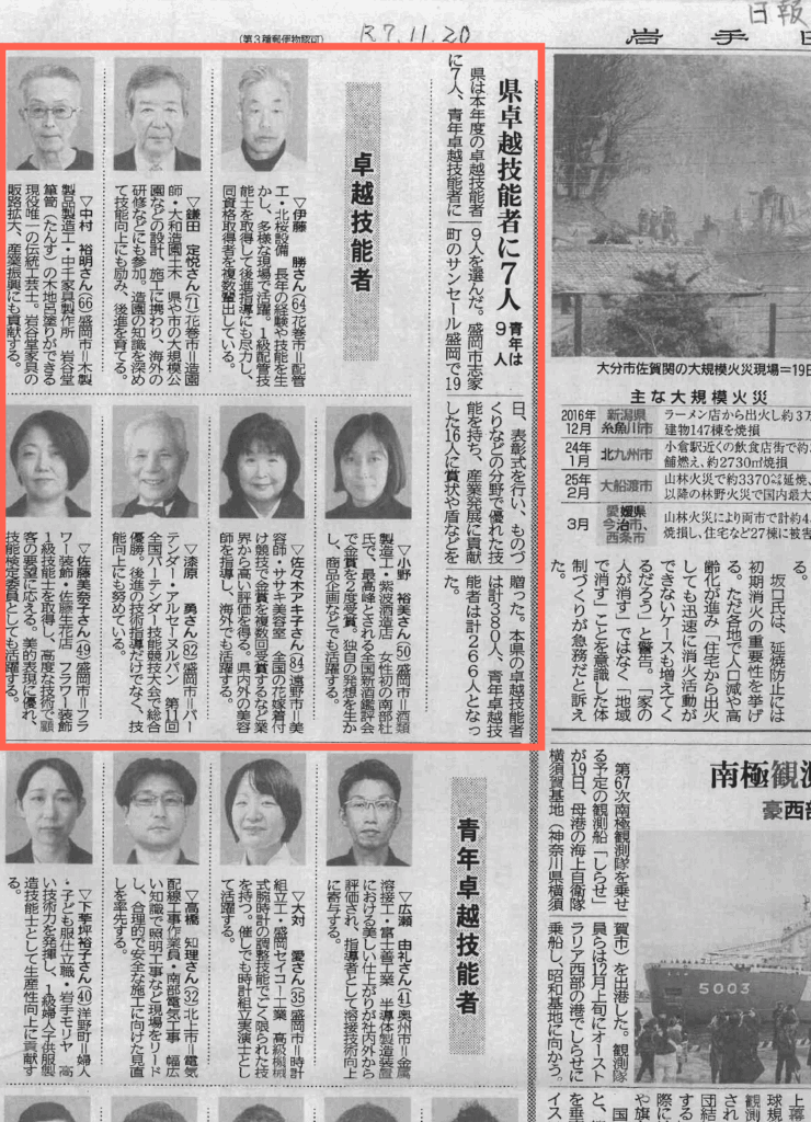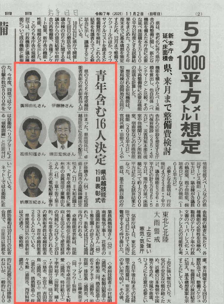 このたび、当社代表が、永年にわたり造園土木の分野で高い技能と品質向上に貢献した功績が認められ、岩手県より「卓越技能者表彰」を受賞いたしました。